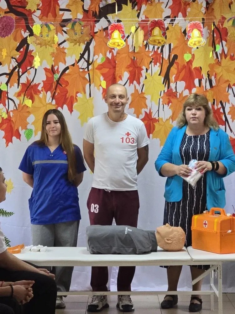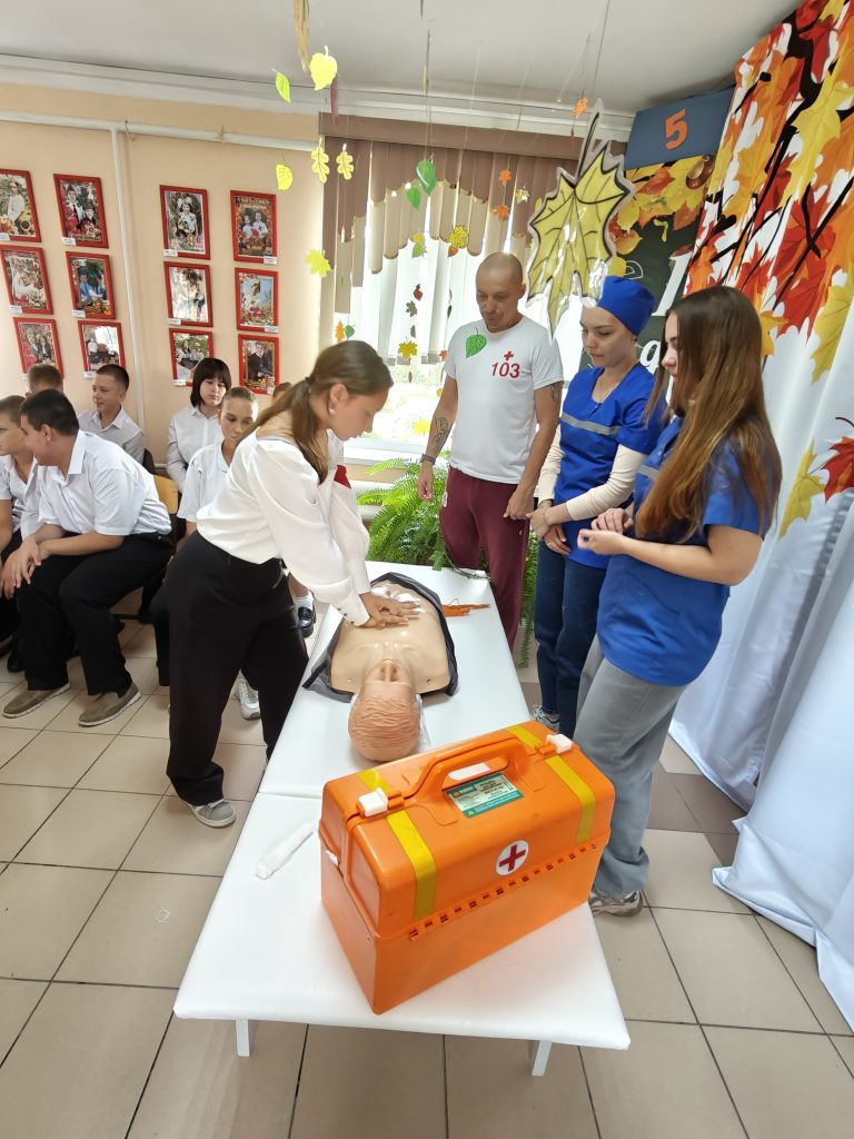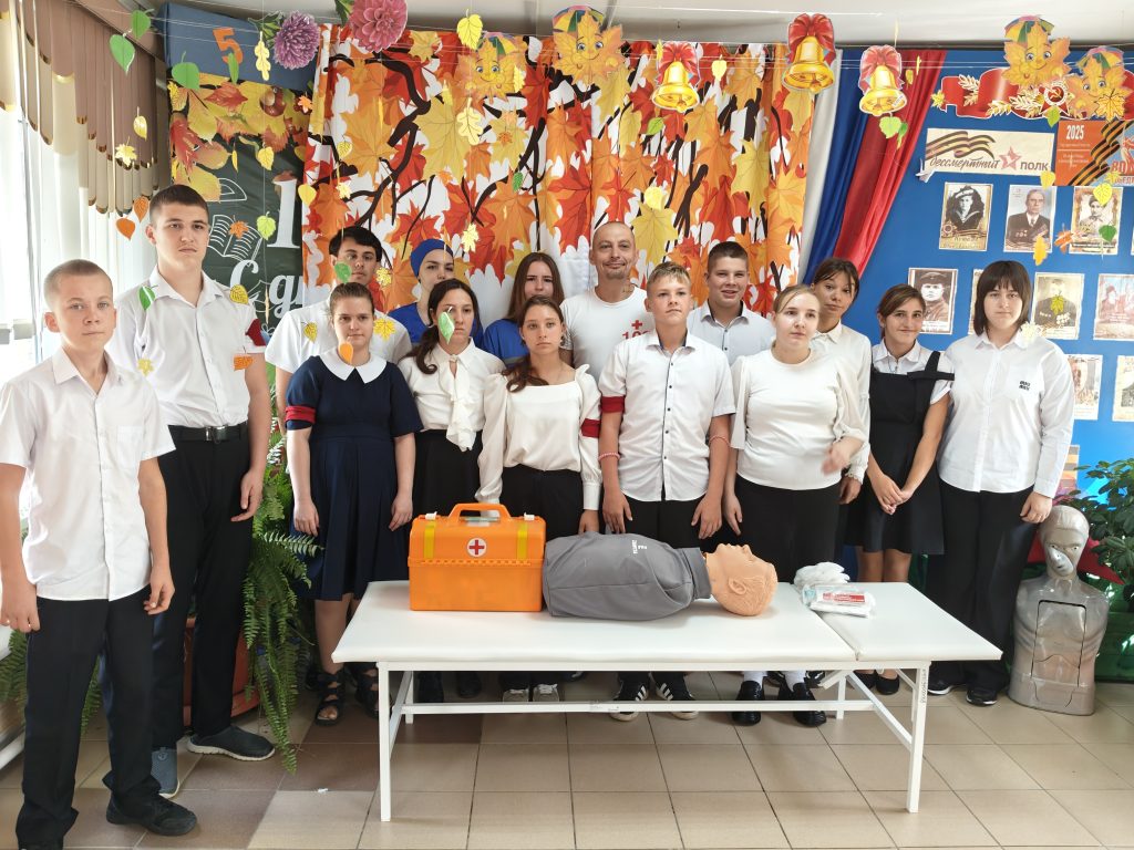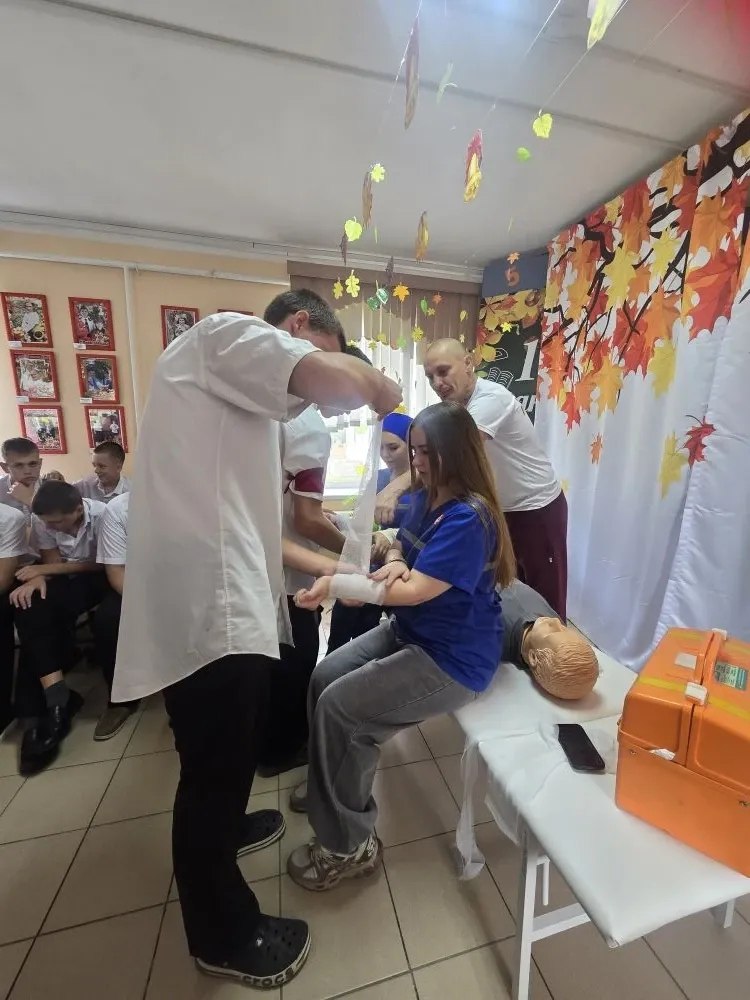 Ученики 7-11 классов с большим интересом приняли участие в занятии, которое провел настоящий профессионал своего дела – старший фельдшер скорой помощи ГБУЗ «Абинская ЦРБ», преподаватель первой помощи пострадавшим центра медицины катастроф Краснодарского края, Наумов А.А. Александр Александрович не только поделился бесценными знаниями, но и продемонстрировал на практике, как действовать в экстренных ситуациях. Интерес к мероприятию придали студентки 2 курса отделения «Лечебное дело» ЧПОУ «АИТ» – Алина и Виктория. Они активно помогали в проведении занятия, демонстрируя различные приемы и отвечая на вопросы ребят. Учащиеся получили ценные навыки, которые могут пригодиться в любой момент жизни