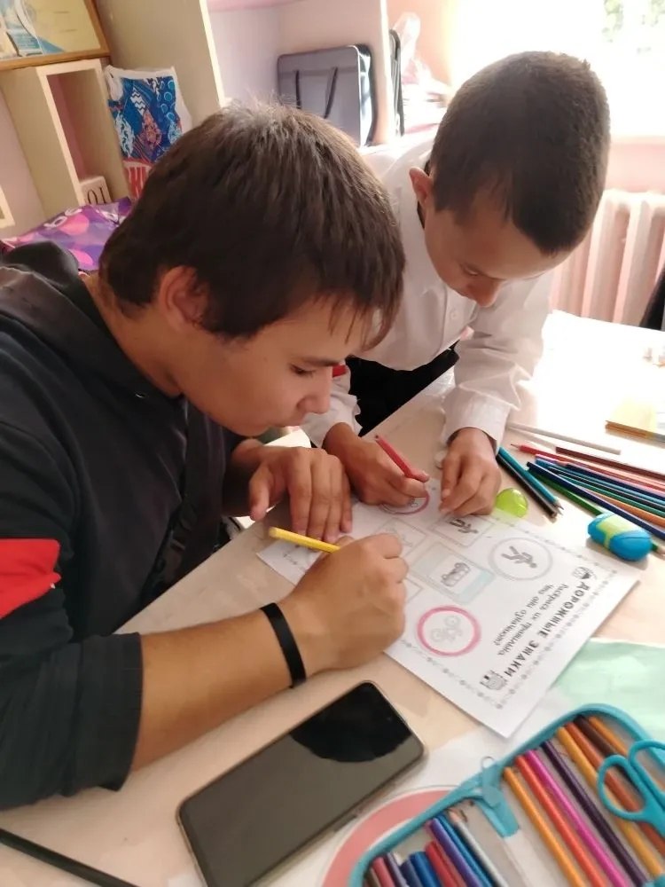 Для шестиклассников проведено внеклассное занятие «Дорожная азбука.». Дети познакомились с дорожными знаками, ответили на вопросы, раскрасили знаки и картинки с ситуациями на дорогах. Проработали алгоритмы поведения на дороге.