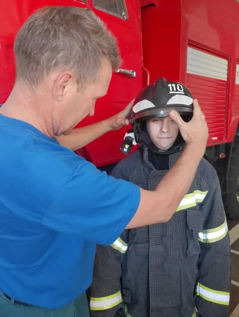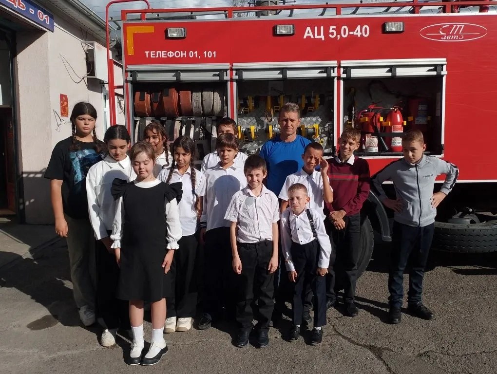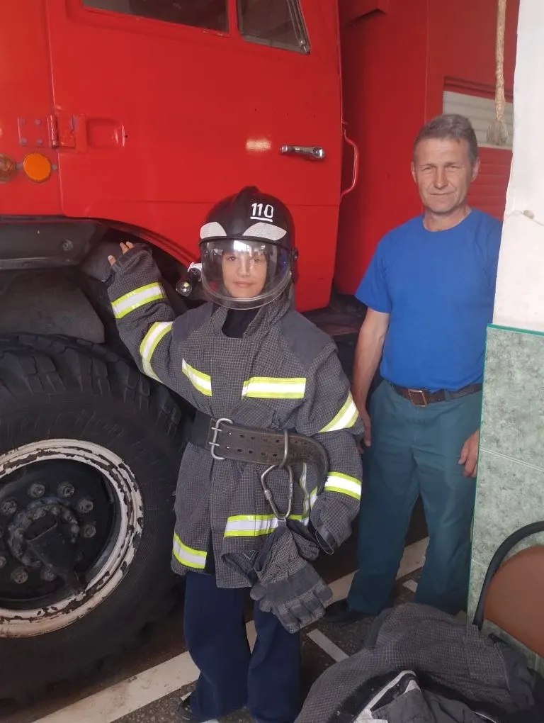 в пожарной части. Дети познакомились с техникой, спецодеждой и работой пожарных. Повторили правила техники безопасности с открытым огнем.