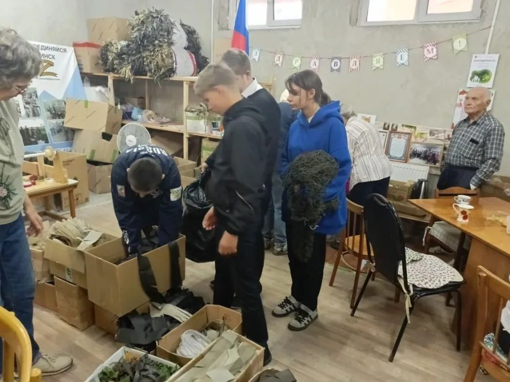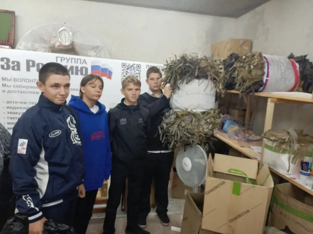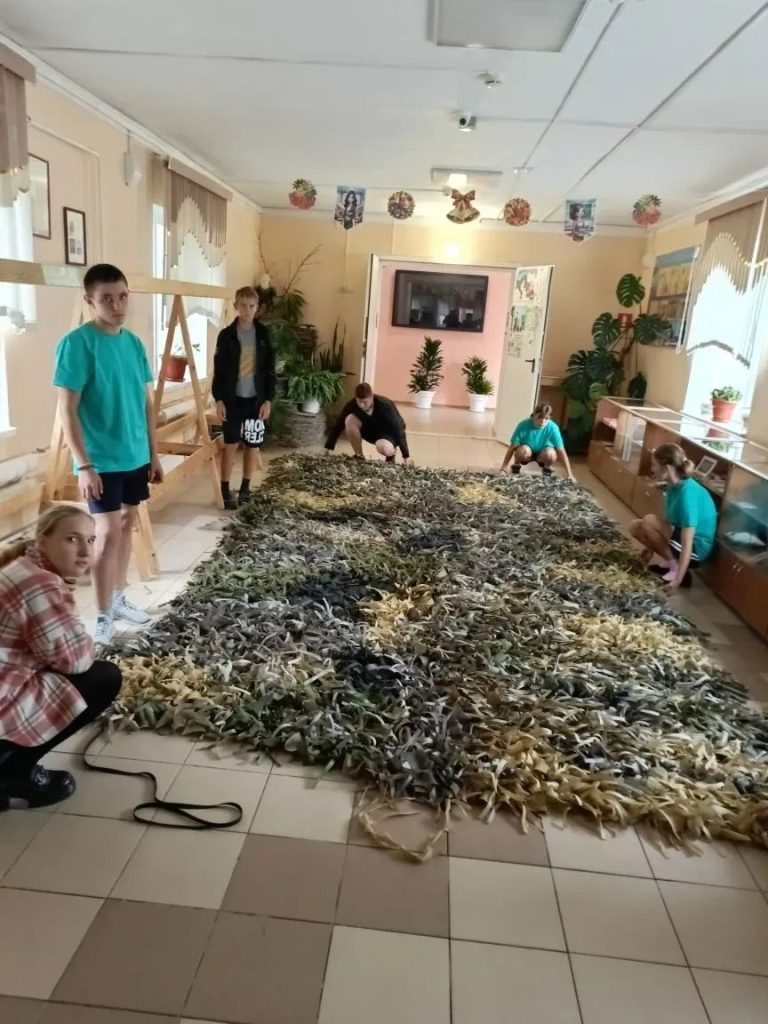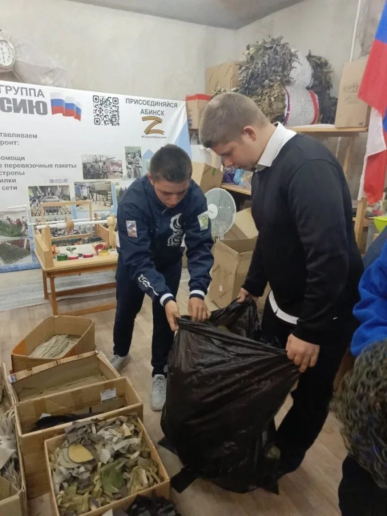 Очередную маскировочную сеть сплетённую руками школьников школы- интерната N2 г. Абинска собрали и упаковали ученики 9Б класса. Ребята отвезли сеть в штаб волонтёрской организации «За Россию», где общались с волонтёрами и получили материал для новой маскировочной сети.