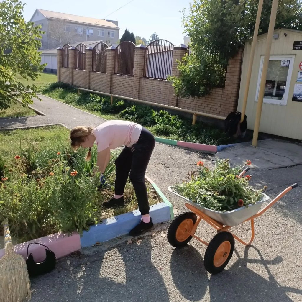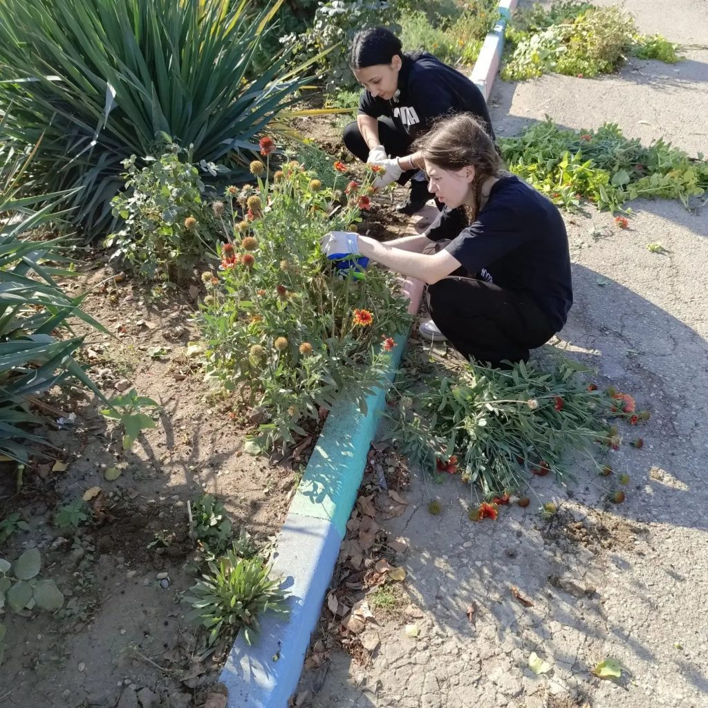 Урок труда(технологии) профиль «Рабочий зелёного хозяйства » в 11а классе. С учителем Онетко Н.А. учащиеся проводят обрезку роз, убирают отцветшие однолетние растения, проводят осеннюю обрезку многолетних растений, приступили к осенней перекопке клумб.