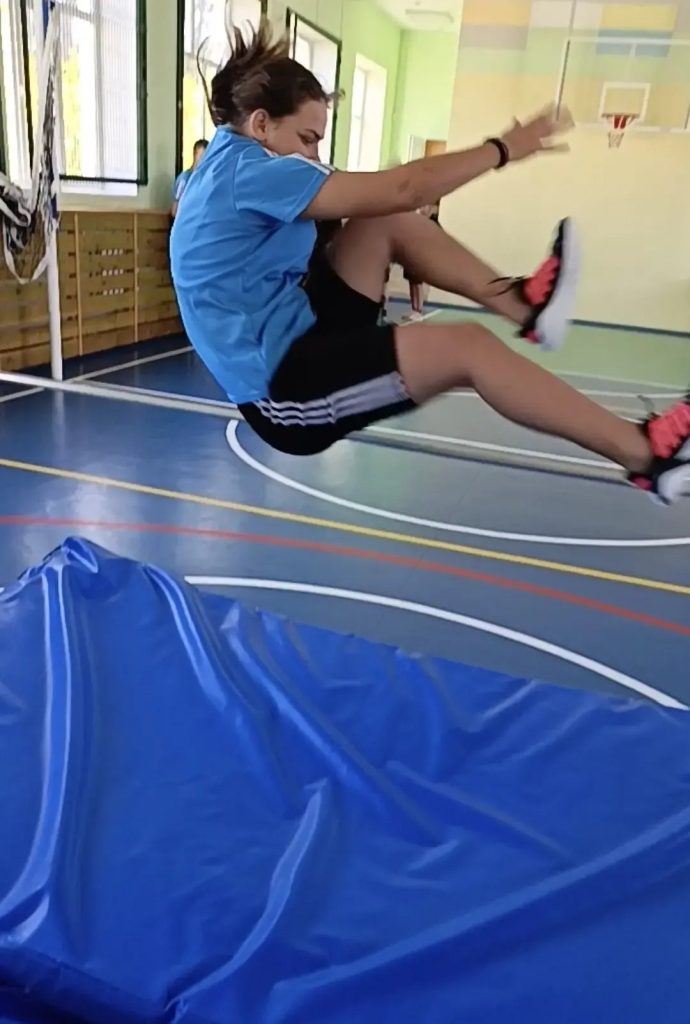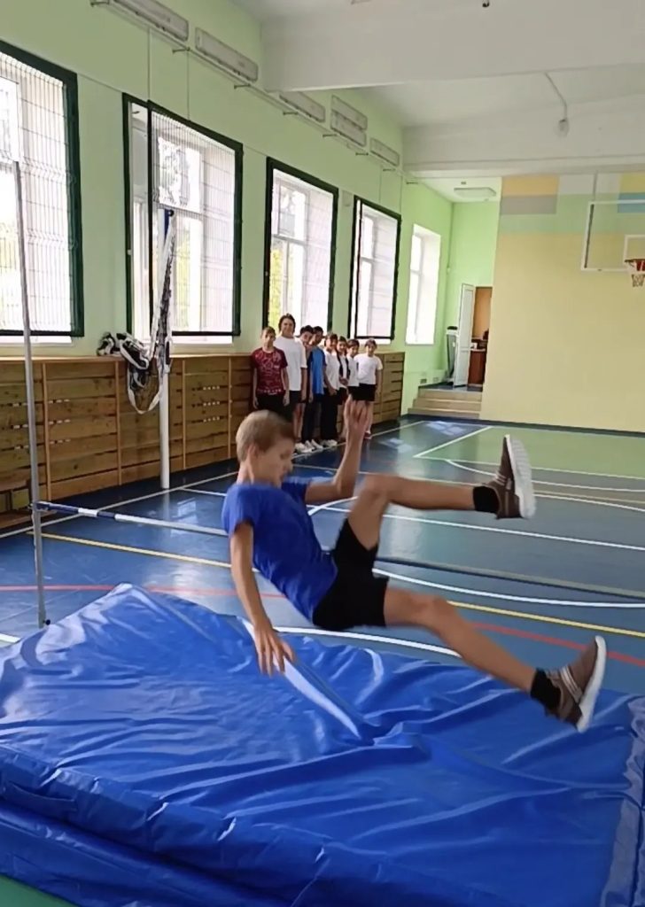 Ребята отрабатывают технику прыжков в высоту перекатом. Закрепление темы. Учитель Нечай В.А.