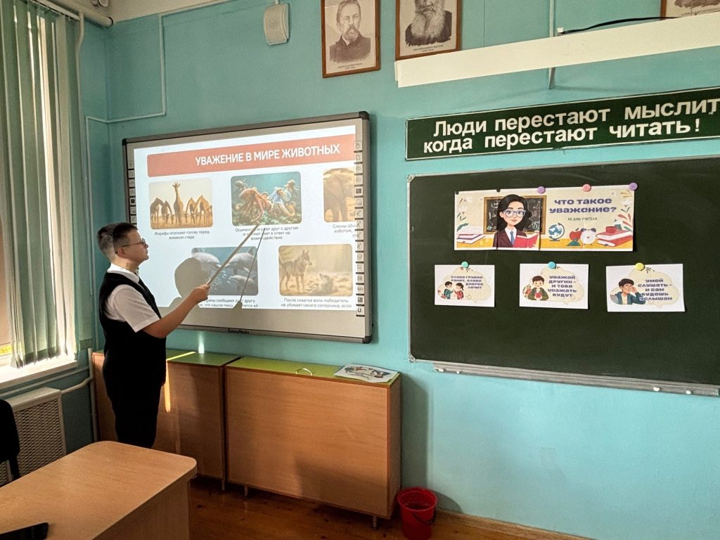 1.09.2025 г. 5 «а» класс. Учитель поздравил школьников с началом учебного года, подчеркнул, что это особенный день — началом нового учебного года. Учитель рассказал ребятам, что знания — это увлекательный путь в большую жизнь, которую они начинают сегодня. Учитель рассказал, предстоит открыть удивительный новый мир-мир знаний, а значит придется потрудиться и помогут в этом учителя, одноклассники и учебники. Впереди ребят ждёт много открытий и уроков, а каждая новая неделя будет начинаться с занятия «Разговоры о важном».